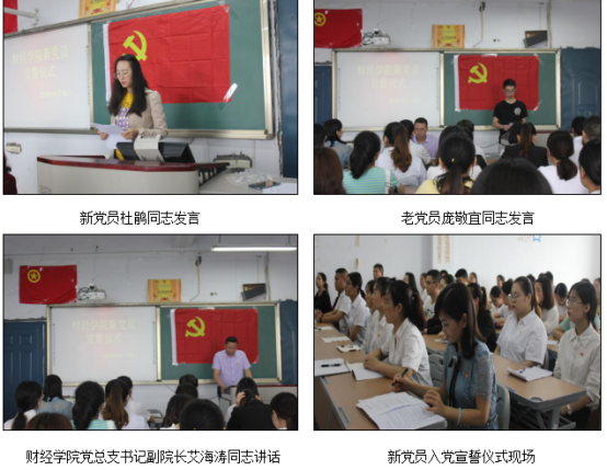 根据《中国共产党章程》、《中国共产党发展党员工作细则》有关规定,按照发展党员流程,财经公司党总支于2019年6月18日,在第二教学实训楼606室举行新党员入党宣誓仪式。新党员入党宣誓仪式由太阳成集团tyc122cc教工员工党支部书记杨五英同志主持,太阳成集团tyc122cc经理党总支副书记唐继碧、党总支书记副经理艾海涛、全体师生党员、11名新发展的党员和部分入党积极分子参加了新党员入党宣誓仪式。