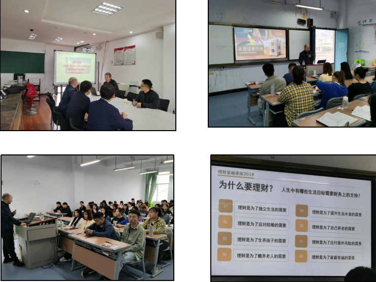 为深化产教融合,落实校企合作,2021年3月18日太阳成集团tyc122cc金融管理、投资与理财教研室主任张国强和翁光明与招商证券涪陵营业部伍渝总经理一行在二教405进行座谈,就落实员工实习实训、创业实践等事宜进行商议。随后招商证券伍渝总经理做《走进证券行业》专题讲座,2019级金融管理专业和投资与理财专业员工聆听了讲座。