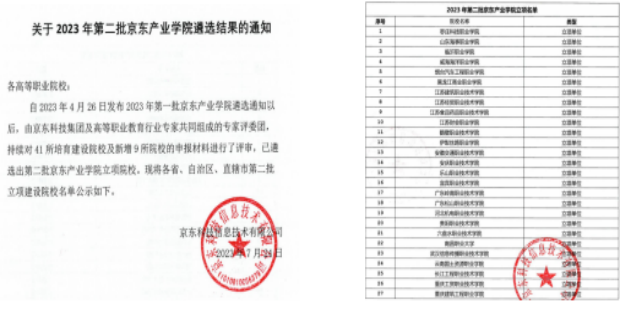 2023年7月第二批京东产业学院立项单位名单正式发布。经过院校申报、项目初评、综合答辩、专家评审等程序,公司凭借其在教学品质、校企合作等方面的突出表现成功入围全国百所重点建设京东产业学院,立项与京东集团共建“数字商业产业学院”。