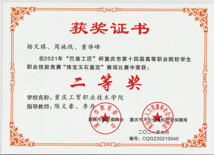 2021年“巴渝工匠杯”重庆市第十四届高等职业院校员工生职业技能竞赛“珠宝玉石鉴定“赛项 二等奖获奖证书