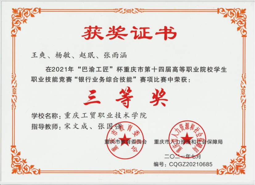 2021年“巴渝工匠杯”重庆市第十四届高等职业院校员工生职业技能竞赛“银行财务综合技能“赛项 三等奖获奖证书