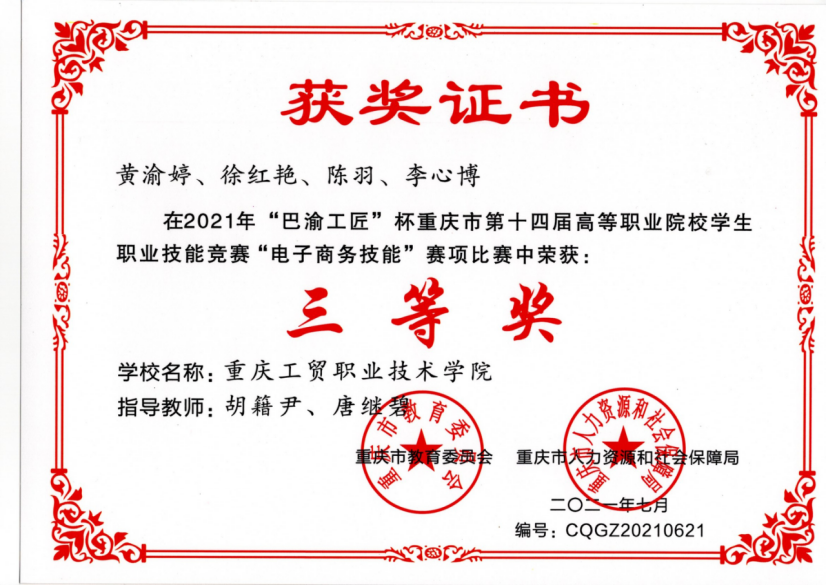 2021年“巴渝工匠杯”重庆市第十四届高等职业院校员工生职业技能竞赛“电子商务技能“赛项 三等奖获奖证书