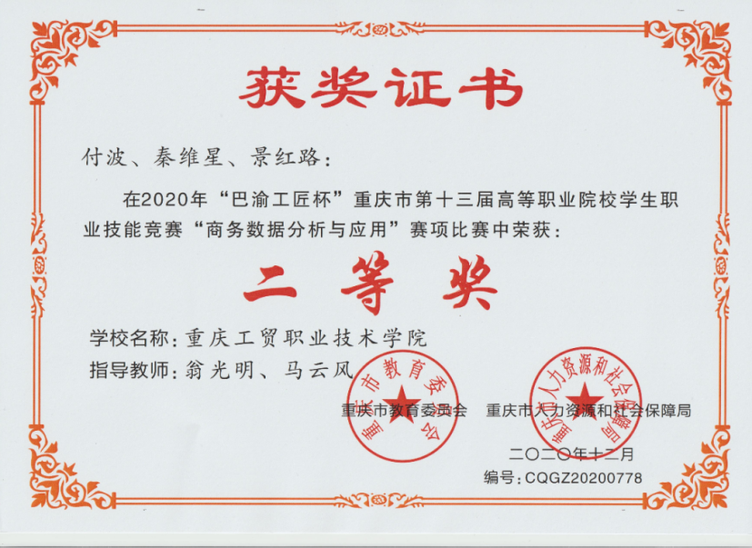 2020年“巴渝工匠杯”重庆市第十三届高等职业院校员工职业技能竞赛“商务数据分析与应用”赛项二等奖获奖证书
