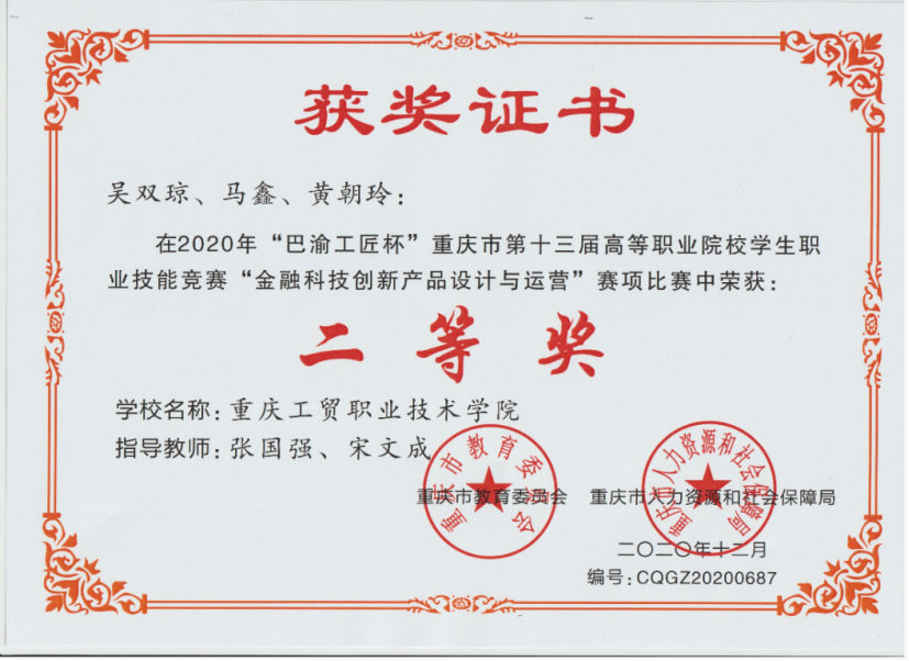 2020年“巴渝工匠杯”重庆市第十三届高等职业院校员工职业技能竞赛“金融科技创新产品设计与运营”赛项二等奖获奖证书