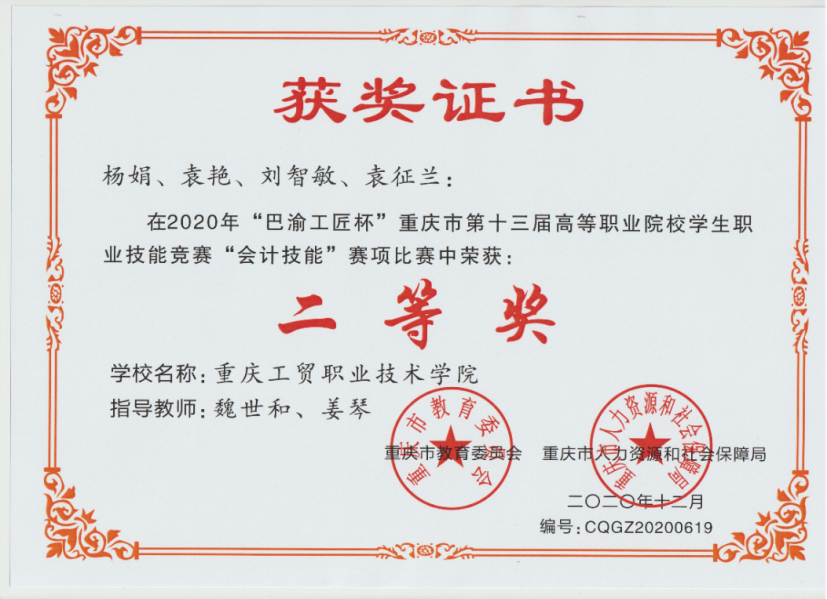 2020年“巴渝工匠杯”重庆市第十三届高等职业院校员工职业技能竞赛“会计技能”赛项二等奖获奖证书