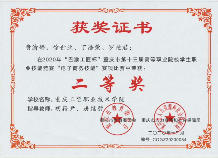 2020年“巴渝工匠杯”重庆市第十三届高等职业院校员工职业技能竞赛“电子商务技能“赛项二等奖获奖证书