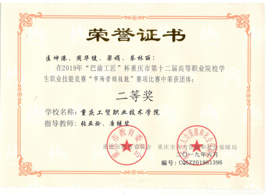 2019年“巴渝工匠”杯重庆市第十二届高等职业院校员工职业技能竞赛“市场营销技能”赛项团体二等奖获奖证书