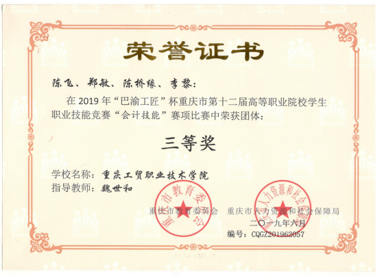 2019年“巴渝工匠”杯重庆市第十二届高等职业院校员工职业技能竞赛“会计技能”赛项团体三等奖获奖证书