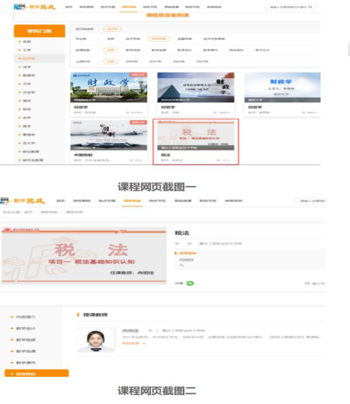 在“新华思政”面向全国各高校征集优质课程思政案例课资源时,公司积极响应学校的号召,安排落实大数据与会计专业冉明佳老师通过教学视频、教学设计、教学课件和教学说课等四个方面,详细制作《税法》这门课程的课程思政教学资源,并从价值引导、元素挖掘、实施成效等多维度对教学资源进行说明,目前该课程的课程思政资源已经展示在新华网“新华思政”的平台上。