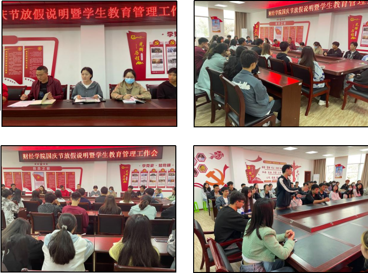 首先,艾书记对国庆节学校放假三天进行了说明,一是疫情形势严峻,全国的形式不乐观,涪陵周边区县也有零星出现。二是重庆高校国庆节基本都是放假2天或者3天。三是国庆节长假人流流动性大,不利于疫情防控。四是从政治高度看,马上要召开党的二十大。五是国庆节剩余假期调入寒假。要求大家下去做好班上其他同学的解释工作。贯彻传达了学校《2022年国庆假期及前后新冠肺炎疫情防控工作方案》的通知。他强调,我们要充分认识疫情防控严峻形势,疫情期间离校要做好个人防护,戴好口罩,尽量做到非必要不离校,非必要不离涪,非必要不离渝,对个人行程轨迹不瞒报、谎报,返校后必须配合学校进行全员核酸检测。艾书记还列举了一些同学因疫情期间谎报瞒报而造成的严重后果,让同学们知晓谎报瞒报的严重性。对国庆节前后的安全稳定工作也做了强调。
