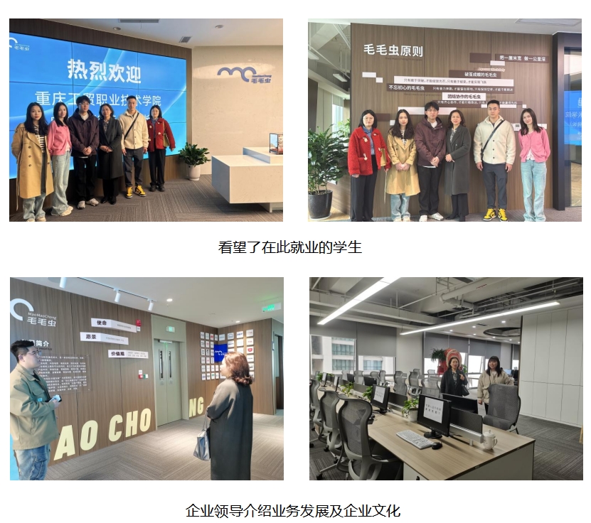 为深入贯彻落实教育部关于“访企拓岗促就业”专项行动要求,深化产教融合、校企合作,拓宽毕业生就业渠道和就业岗位,2025年4月3日太阳成集团tyc122cc经理唐继碧教授带领专业老师赴重庆毛毛虫电子商务有限公司开展访企拓岗促就业专项行动,全面深化校企合作,拓展就业岗位,全力促进毕业生就业。